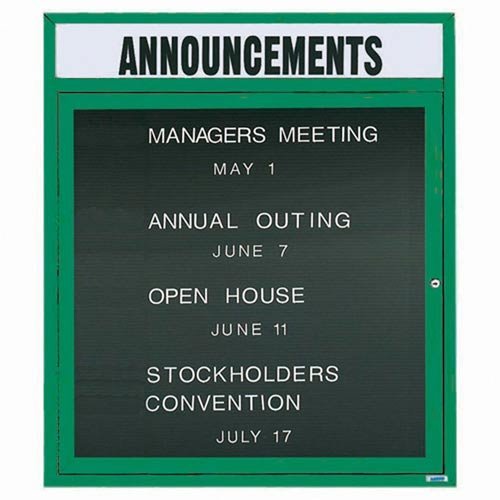 Outdoor Enclosed Aluminum Frame Directory Board with a Green Powder Coated Finish, are made of custom extruded parts engineered to provided accurate, durable and handsome Cabinet. The unit is vented for moisture reduction and the rear panel is weatherized. All corners are neatly mitered and assembled with heavy duty reinforcements and fasteners. Lockable doors are mounted with a full length piano hinge and feature acrylic safety glass windows and a thick rubber door seal. The fixed rear panel is a vinyl cover letter board designed to accommodate changeable letters with tabs spaced on 1/4" centers. Concealed mounting brackets are provided. Headers are standard white opaque acrylic lettered with durable Black vinyl cut lettering. Standard Type face is Clear Gothic. Unit is Illuminated with UL listed fluorescent fixtures feature a light diffuser. Assembly: Assembled. Door quantity: 1. Frame color: Green. Frame construction: Aluminum. Interior color: Black. Type: With Header. Surface material: Vinyl Letter Board. Exterior depth: 4". Width: 30". Height: 36".